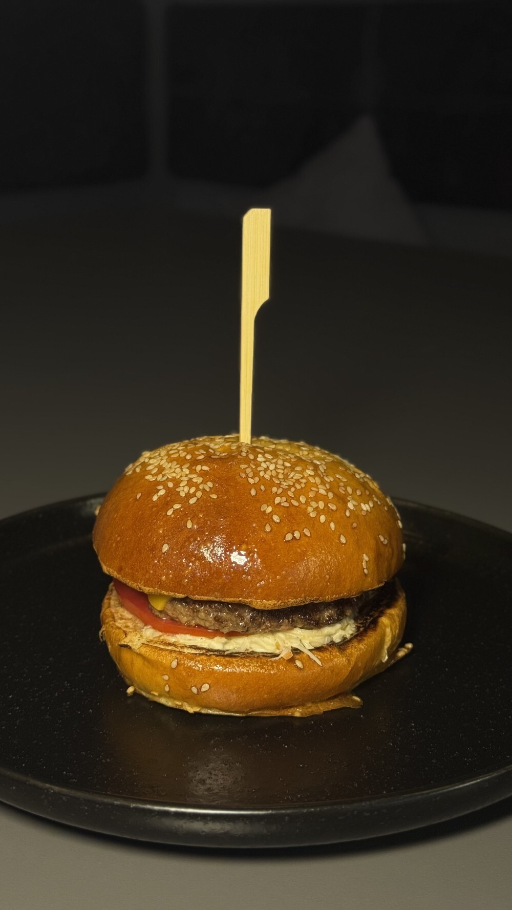 Булочка бриошь, котлета из мраморной говядины, салат Коул Слоу, томат, сыр Чеддер, маринованный огурчик, соус фирменный