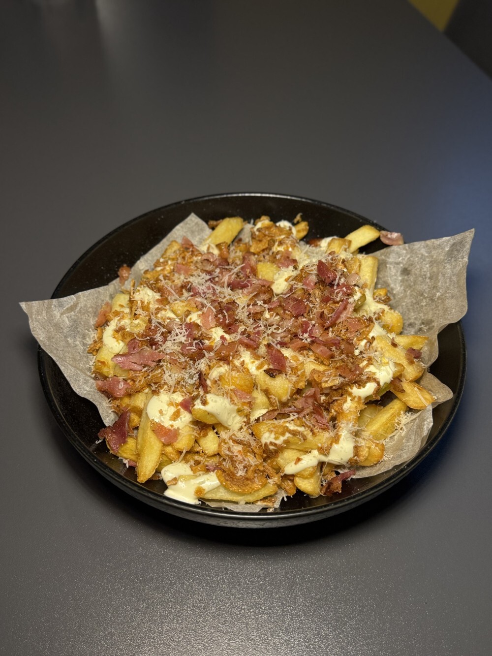 Картошка фри, лук жаренный, бекон, пармезан, соус фирменный