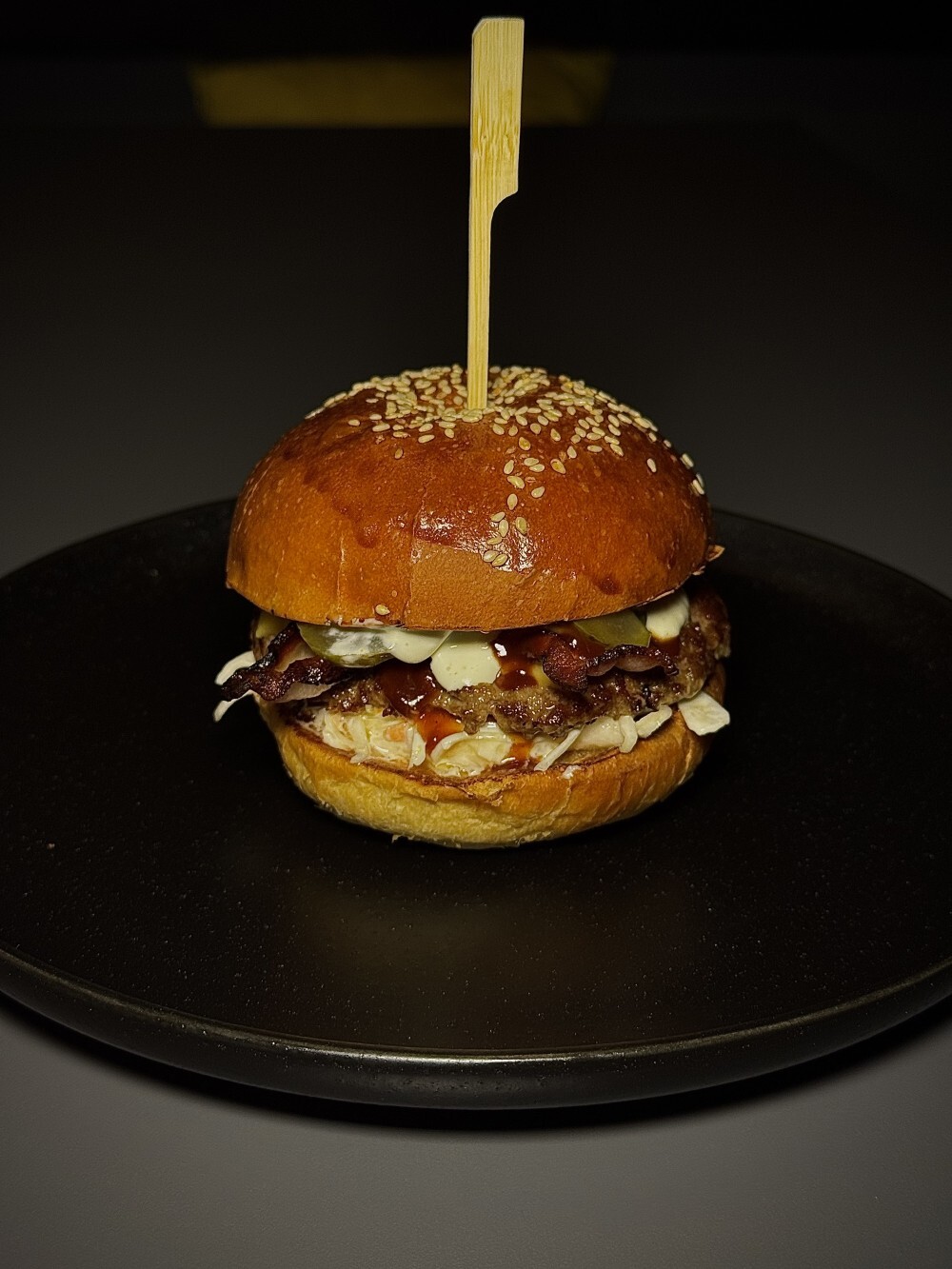 Булочка бриошь, котлета из мраморной говядины, салат Коул Слоу, бекон х2, сыр Чеддер х2, маринованный огурчик, соус фирменный, bbq