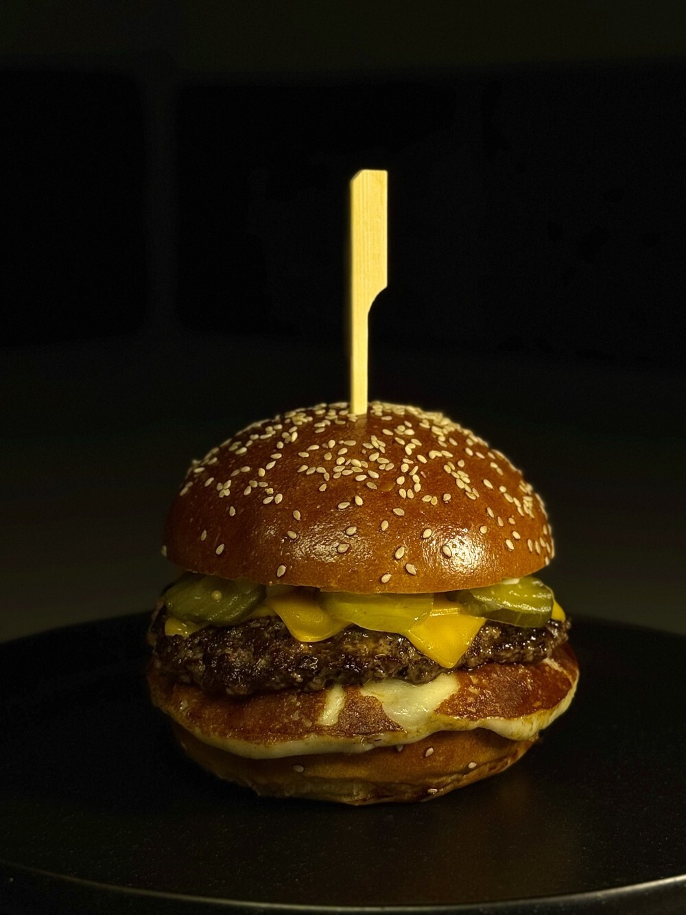 Булочка бриошь, котлета из мраморной говядины, сыр Сулугуни, томат, сыр Чеддер, маринованный огурчик, соус фирменный, сырный