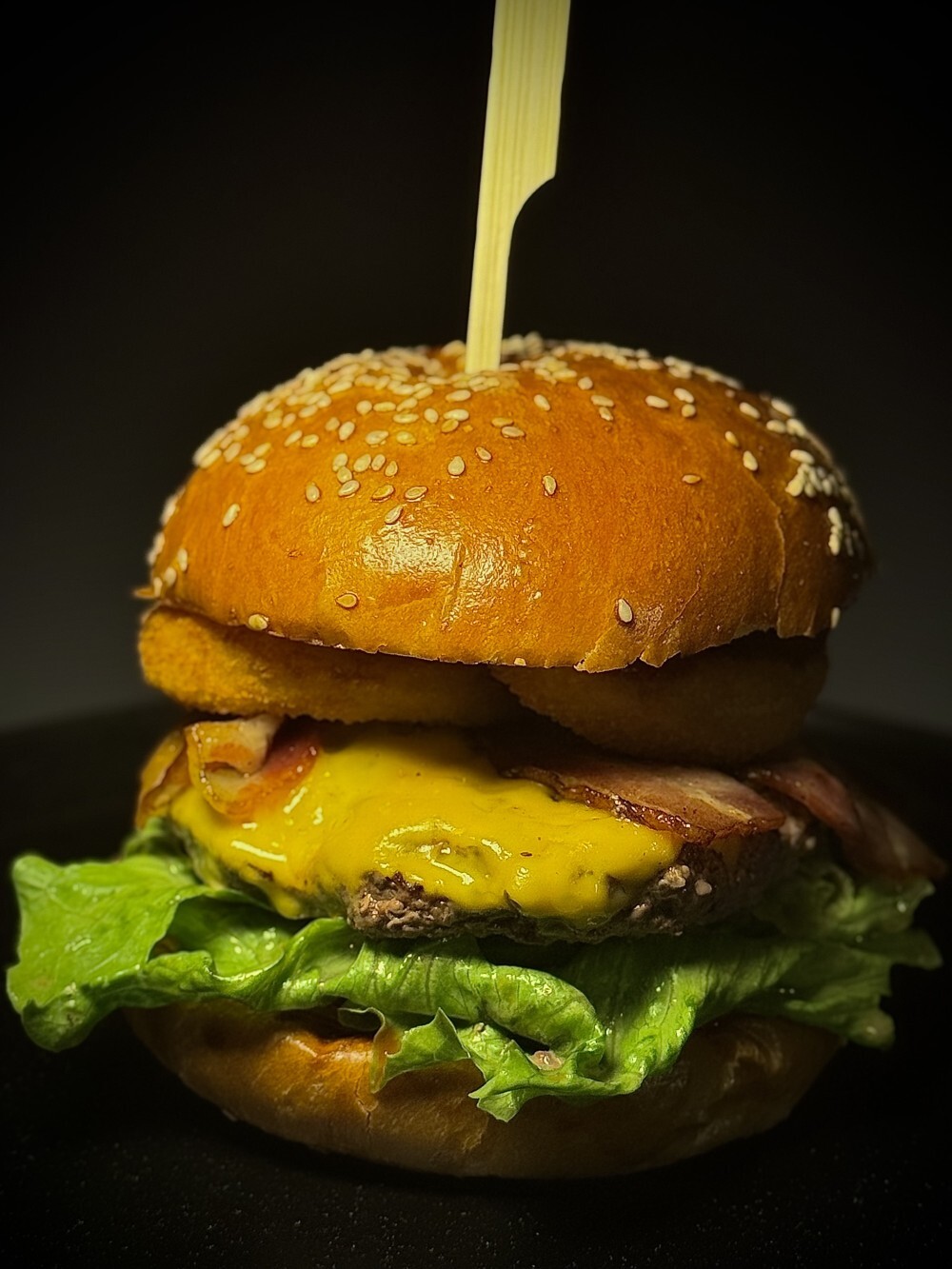 Булочка бриошь, котлета из мраморной говядины, салат айсберг, томат, лук, сыр Чеддер х4, бекон х2, луковые кольца х3, маринованный огурчик, соус фирменный, bbq